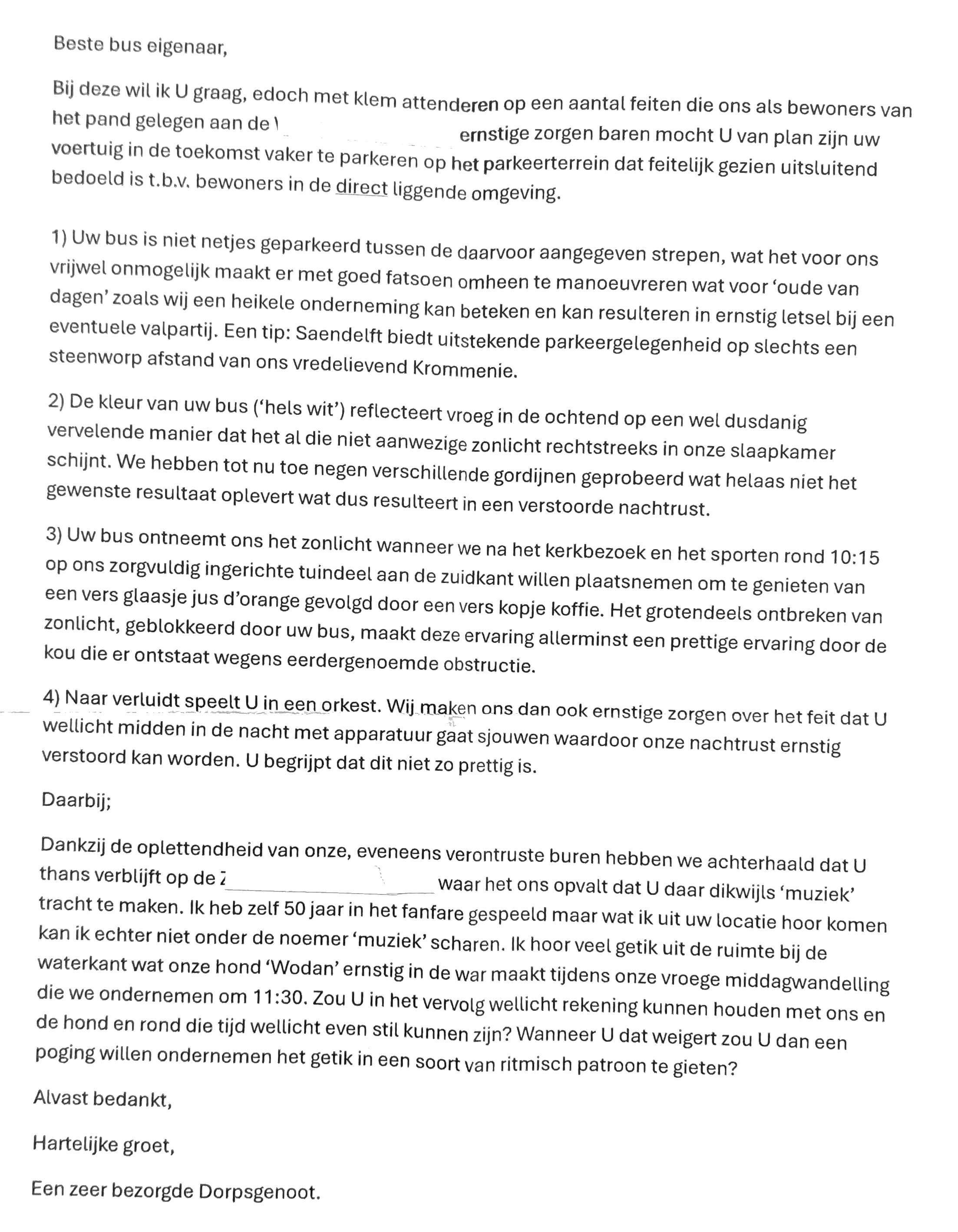 Op 16 maart 2026 ontving mijn buurman, vriend en bandgenoot Jeroen Booy dit schrijven van een 'Zeer bezorgd Dorpsgenoot'. Ongelooflijk, toch!?...