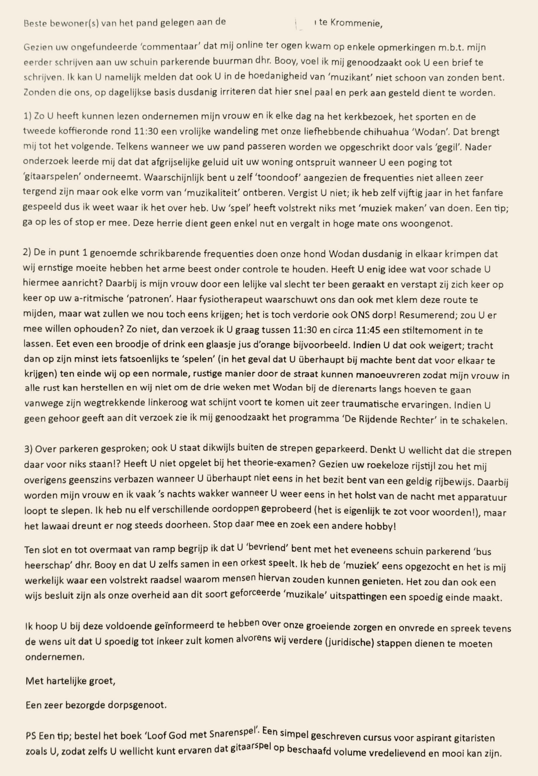 Lees meerOp 16 maart 2026 ontving mijn buurman, vriend en bandgenoot Jeroen Booy dit schrijven van een 'Zeer bezorgd Dorpsgenoot'. Ongelooflijk, toch!?...